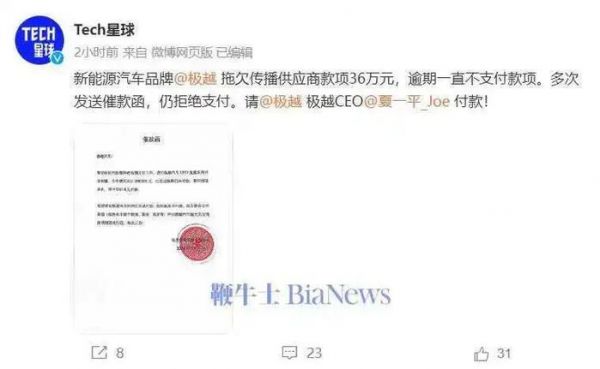 昨天,“Tech星球”在社交平台公开@极越,表示极越拖欠传播供应商款项36万元,逾期一直不支付款项,多次发送催款函,仍拒绝支付。不得不“在线讨债”。