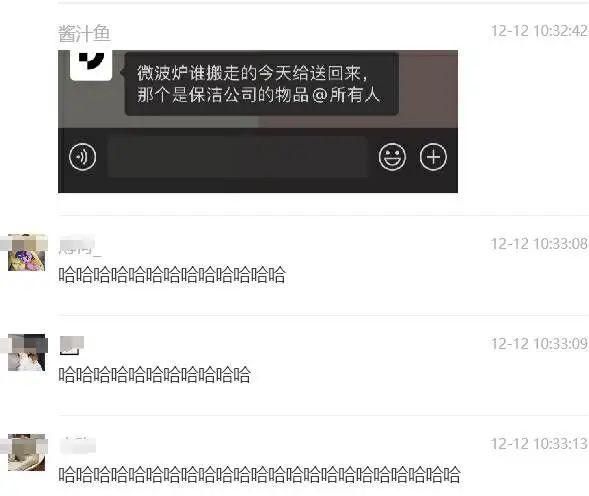 据网络流传的一张截图,“微波炉谁搬走的今天给送回来那个是保洁公司的物品 @所有人”,笑不活了。
