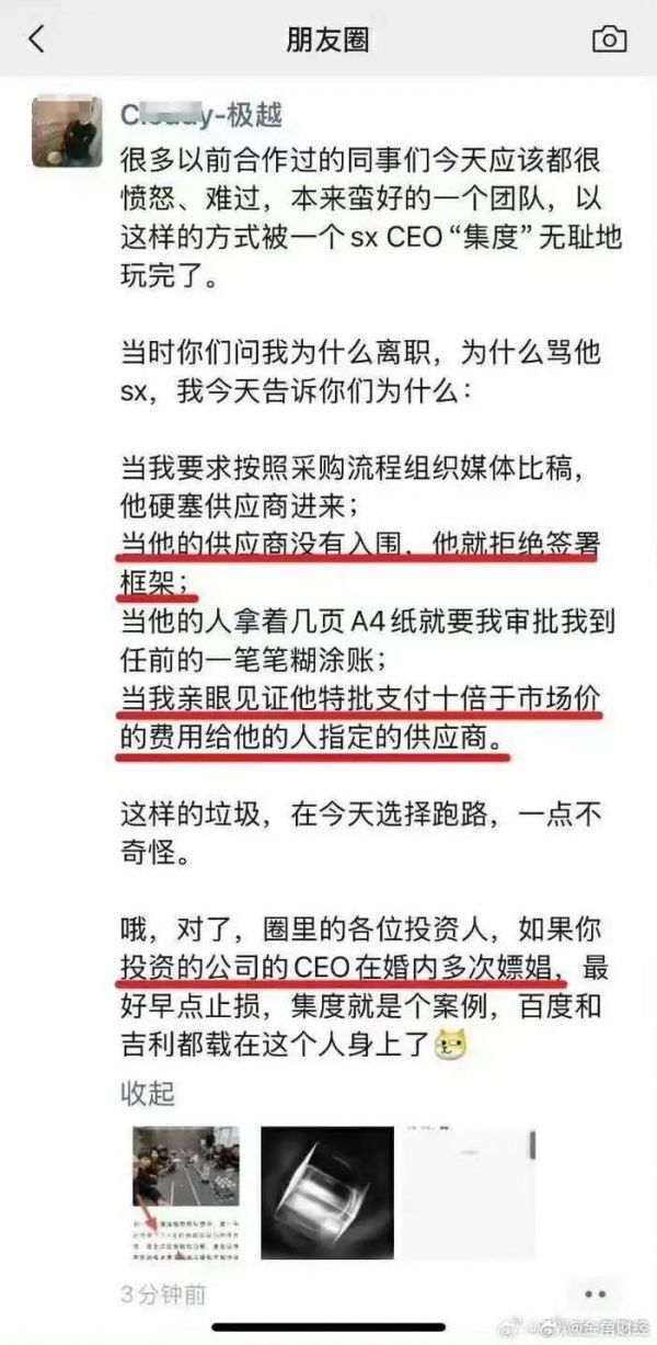 他怒斥CEO无耻,而且列举了CEO很多疑似涉嫌贪腐的行为,比如“硬塞供应商进来”,比如“支付十倍于市场价的费用给指定的供应商”.....该截图还暗示,某人存在婚内多次PC的经历...如果上述内容属实,某人可能涉嫌严重的贪污腐败行为,可能涉嫌犯罪。
