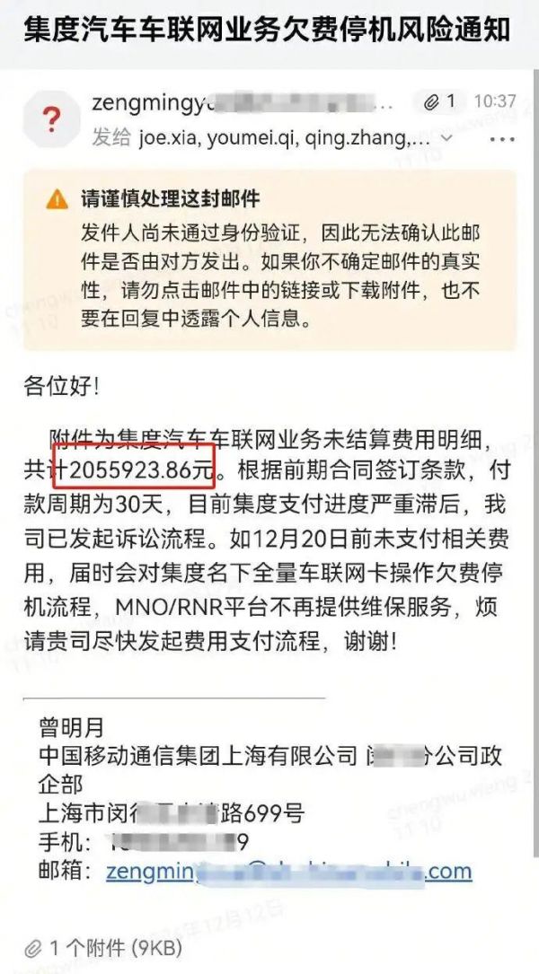 令据网友透露,上海移动公司还在找集度汽车(即极越)讨要集度名下全量车联网卡的网费。从截图看,欠了205.59万元。如果到期不支付,是不是意味着极越老车主将断网了?