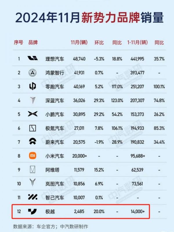 2023年10月,其首款车型极越01上市,是一台中大型纯电SUV,售价21.99-30.99万元。今年9月,第二款车极越07上市,这是一台中大型轿车,售价20.99-29.99万元。数据显示,极越汽车在11月交付2485辆车;今年1~11月累计交付超1.4万辆新车。