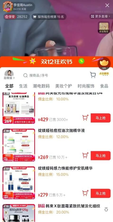 近日,一张显示有双12期间李佳琦直播间佣金比例的截图在网络流传。根据截图内容,李佳琦直播中推销的护肤品佣金比例区间为10%-20%。