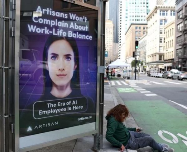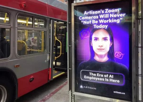 除了“停止雇佣人类”这个标语,类似的广告海报也出现在旧金山的各个地方,标语不尽相同、但却同样夸张且讽刺:“人类已经过时”、“AI 员工的时代来了”、“Artisans 不会抱怨要平衡生活与工作”。