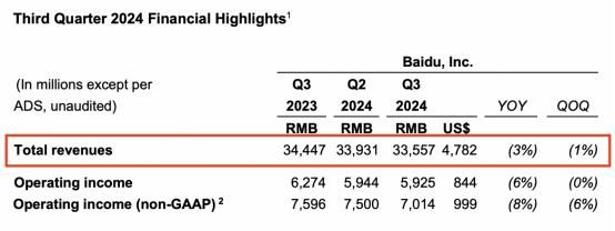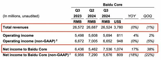 财报显示,百度2024年第三季度营收为335.57亿元,去年同期为344.47亿元;核心营收为265.24亿元,去年同期为265.72亿元;归属百度核心的净利润为75.36亿元,去年同期为64.36亿元。