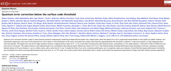 这是自计算机科学家 Peter Shor 1995 年提出“量子纠错”概念以来的一次重大突破。根据谷歌发表的论文,如果未来进一步将量子比特增加,错误率将会指数级下降,降到 10^-10 量级。
