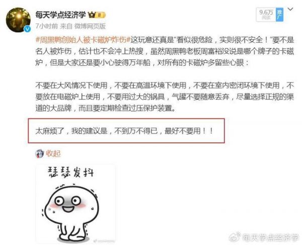 因为周富裕被炸伤,引发了不少网友对卡磁炉这一产品的强烈好奇,当然更多的网友还是表达了对这一品类的担忧,微博平台上,也有媒体提及了卡磁炉的诸多注意事项,给人的直观印象是,这玩意儿,能不用最好不要用。