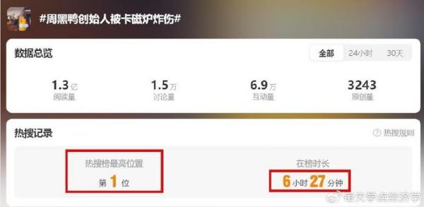 12月11日,“周黑鸭创始人被卡磁炉炸伤”的话题,很快冲上热搜榜,并在一从媒体和自媒体跟进讨论之下,冲上了热搜第一,并保持长达数小时之久,截至本文发稿,相关话题阅读量已突破1.3亿;