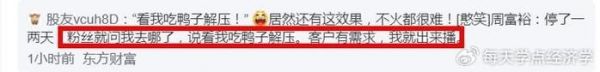 还有一个细节也能看出周富裕对Z世代网友的喜好有着相当到位的拿捏,比如“看我吃鸭子解压!”这个亮点的捕获,可以说是对消费心理的深度洞察才有的结果,因为这句近乎slogan的词语,有着十分显性的好处: