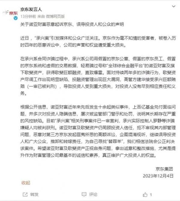 自己可不是软柿子,立刻反击,声明无辜,被恶意诉讼,声誉受损。京东还指出诺亚财富尽调失职,同时表明自己积极配合警方,助力破案。