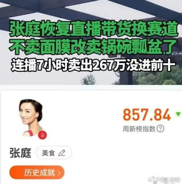 张庭的账号从9月份就开始了尝试,只是都是自己试试水悄悄发点健身、护肤以及日常保养的内容。而直到12月份后直接变成专场直播,带货厨具赛道还能打出这样的成绩,不过换了赛道的她从平台带货榜上看,并没有闯进前十的名单,所以引得张庭泪洒直播间。