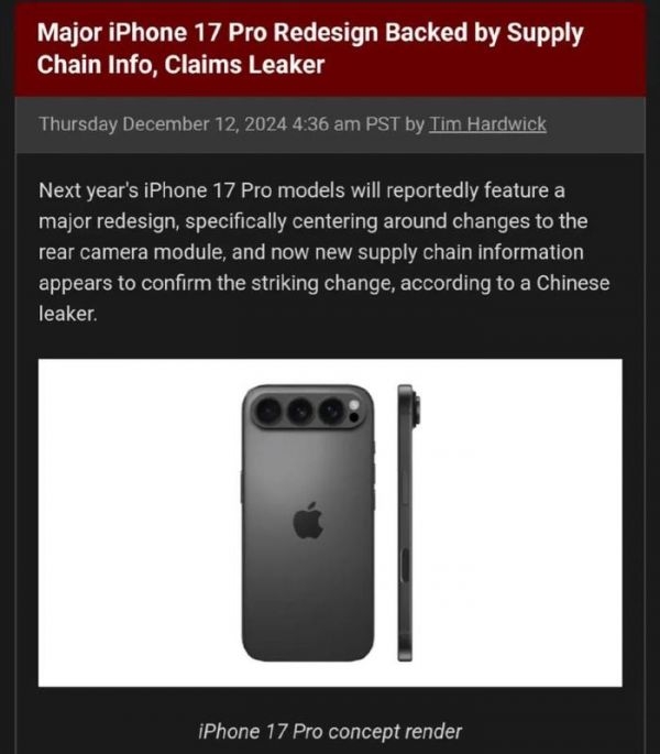 要知道在此之前,iPhone只有SE系列和基础款等入门级型号才会使用铝金属框架,高端iPhone一般采用不锈钢框架,自iPhone 15 Pro后则开始用上钛金属机身。此外,iPhone 17 Pro系列的机身背面也将会有重大的改款。据悉,新该系列新机将采用全新的“铝+玻璃”组合设计。