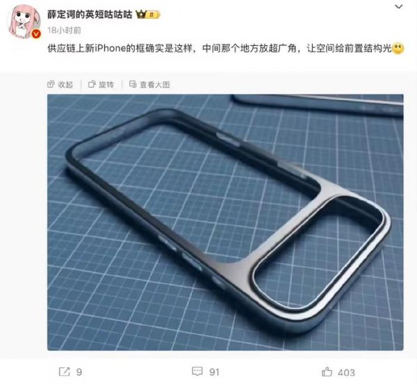 无独有偶,在海外社交平台上,有多位博主也放出了与上述iPhone 17 Pro系列相机模组类似的设计图,从不同角度展示了这一全新的设计理念。此外,消息源“薛定谔的英短咕咕咕”还分享了一张号称是“供应链上新iPhone的框”的照片,并指出该机“中间那个地方放超广角,让空间给前置结构光”。