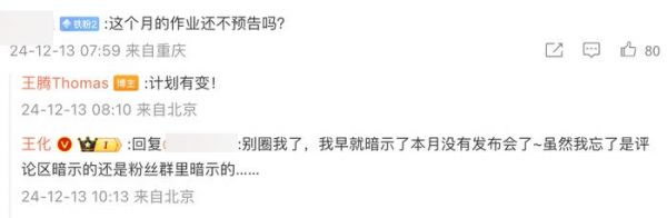 据悉,在网友询问“这个月的作业还不预告吗?”时,王腾表示“计划有变!”