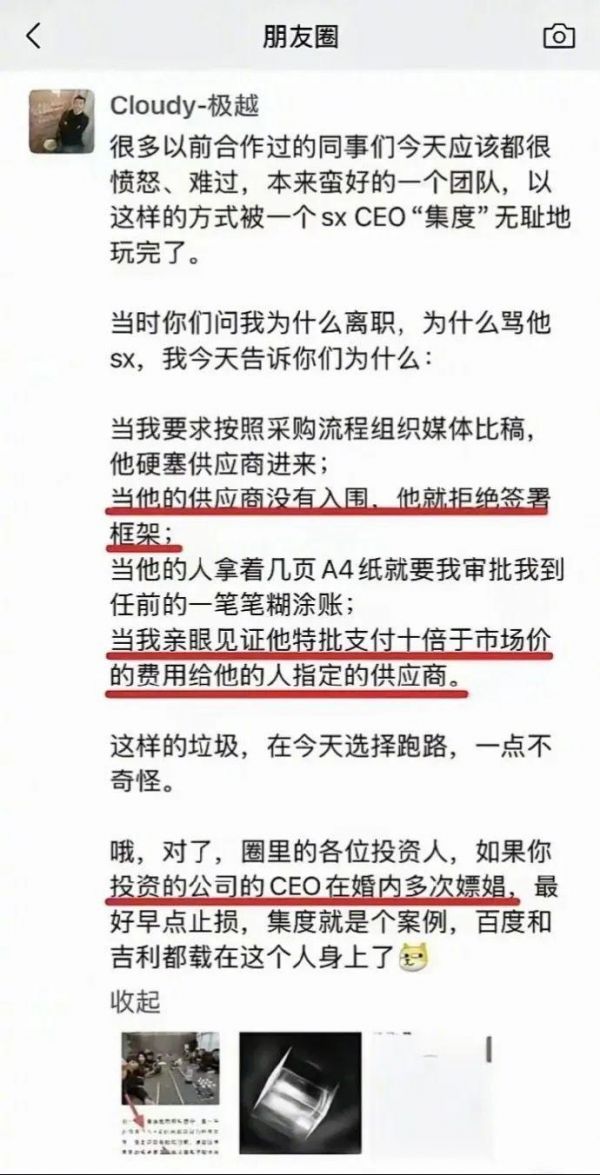 但是,极越员工、媒体对CEO夏一平的声讨并未结束。据爆料,极越高管,贪腐严重,CEO嫖娼,以10倍的成本造车,目的就是为了尽快挥霍完投资人的钱。