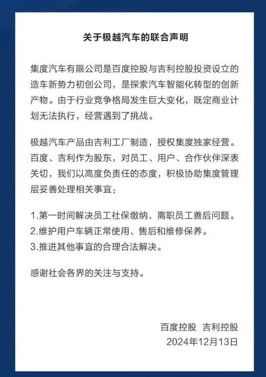极越汽车就地解散,2年亏掉80亿元,员工的社保,工资都没着落。最后,大股东百度、吉利宣布解决员工社保和工资,公司层面风波暂时结束。