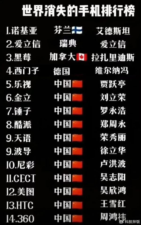 最近我发现网上流传了一张“世界消失的手机排行榜”,其中包含了14个知名手机品牌,但有10个居然都是中国手机品牌。接下来我们一起聊聊看,你曾经都用过哪些已消失的手机品牌?