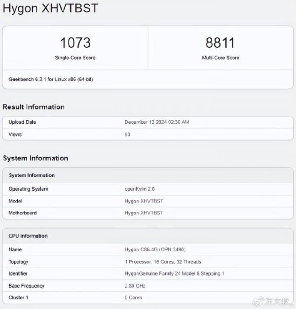 这款名为海光C86-4G的CPU,基于AMD的第一代 Zen 内核,拥有16核心32线程,主频为2.8GHz,基于Geekbench 6.2.1的测试成绩显示,单核性能得分为1073分,多核得分为8811分。