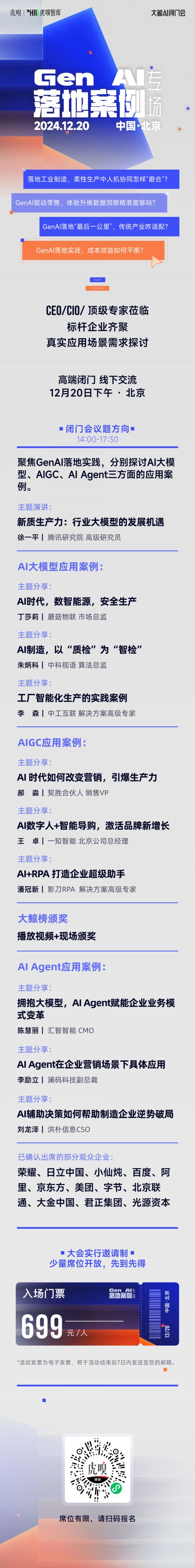 同时,为了更好地展示和交流,我们精心筹备了一场大鲸AI闭门会,时间是本周五(12月20日)下午14点-17点半,地点是北京万科时代中心·十里,九位大鲸代表将来到这场线下闭门会,中科视语、中工互联、蘑菇物联、契胜科技、一知智能、影刀RPA、汇智智能、澜码科技、洪朴信息的核心业务负责人将依次带来案例分享,为我们解析AI Agent、AIGC以及工业大模型等技术在企业实际业务中的落地融合,以及实践过程中踩过的一些坑。