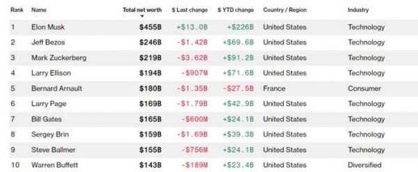 全球十大富豪排行:9个都是美国人,马斯克站稳第一