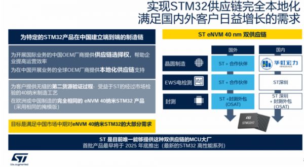 与华虹宏力(HHGrace)合作,在40 nm、OFT、BCD/IGBT技术节点上构建专属产能通道。更重磅的是,40nm eNVM STM32将采用中国和非中国的双重供应链,并计划于2025年底在中国本土生产。联合推出同样的产品并不容易,双方通过两年的合作最大水平保证了设备的兼容性。根据ST的规划,STM32会利用China-for-China的策略,未来5年将本地客户基础扩大50%。