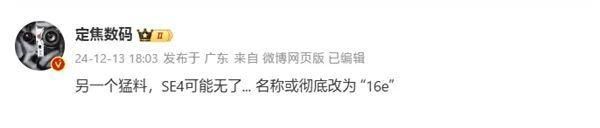 不过,最近却有爆料称,新一代的SE不再延用原命名方案,不叫SE4了,而是改名iPhone 16e。博主@定焦数码表示,“SE4的名称或彻底改为16e”。