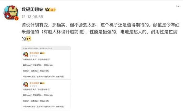 与此同时,博主@数码闲聊站 的一份消息也提到:“腾说计划有变,那确实,但不会变太多,这个机子还是值得期待的,颜值是今年红米最佳的(有超大杯设计超前瞻),性能是挺强的,电池是超大的,耐用性是拉满的”。