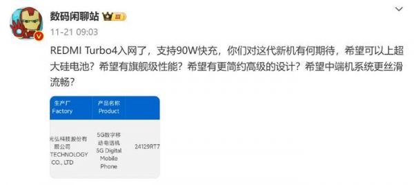 同样来自于博主@数码闲聊站 的爆料显示,这款新机为REDMI Turbo 4。