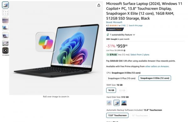 高通说的是事实吗?随机选择亚马逊和百思买这两大电子产品零售平台,选择支持Copilot+的笔记本(目前这是高通独享功能),可以看到高通骁龙X处理器的PC包括微软Surface、华硕Vivobook以及联想Thinkpad 16、三星Galaxy AI Book 4 Edge等产品。这些产品的评价的确普遍在4星以上。