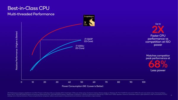 高通直到2023年才彻底摘掉了PC芯片性能孱弱的帽子。去年发布的骁龙X Elite PC处理器直接性能飞跃,Oryon CPU性能超过了当时英特尔、AMD以及苹果的同类产品。高通CEO安蒙更是不断晒出第三方数据,展示高通PC芯片的领先地位。