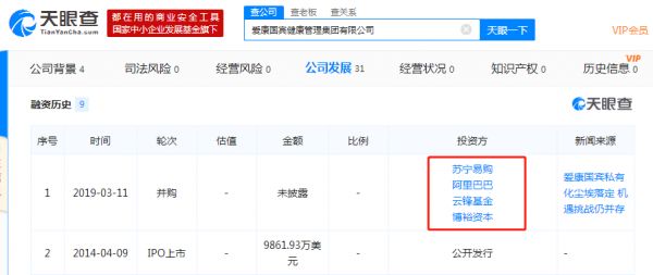 网易科技讯3月12日消息,据天眼查数据显示,3月11日,爱康国宾主体公司爱康国宾健康管理集团有限公司完成并购融资,投资方为阿里巴巴、苏宁易购、云锋基金、博裕资本。