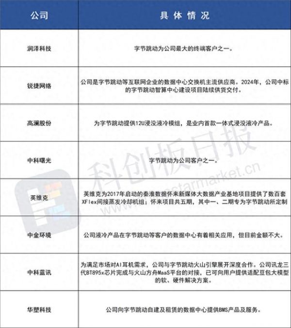 据《科创板日报》不完全统计,A股中字节跳动算力硬件相关公司有: