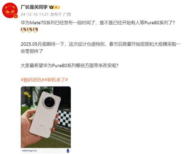 来自博主厂长是关同学的最新爆料显示,华为Pura 80或于明年5月底正式发布,此次华为Pura 80系列的设计也很特别。华为预计正在春节之后,就开始给华为Pura 80系列定版和大规模采用零部件了。