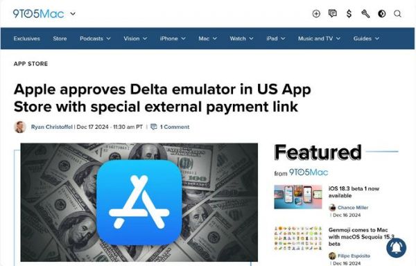 日前,苹果公司批准了一个名为“Delta”的模拟器应用,允许其成为美国App Store中首个支持外部支付链接的应用。