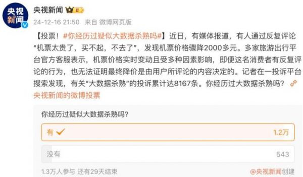 12月中旬,“年轻人反向驯化‘大数据杀熟’”突然火了,不少网友都在网上晒自己的“反击攻略”。有些人分享自己如何用“哭穷”留言让机票变便宜,还有人总结出一套对抗算法涨价的心得。
