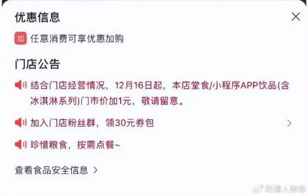 日前,部分门店在小程序发布公告称,综合门店经营情况,12月16日起堂食/小程序APP饮品(含冰激凌系列)门市价加1元。