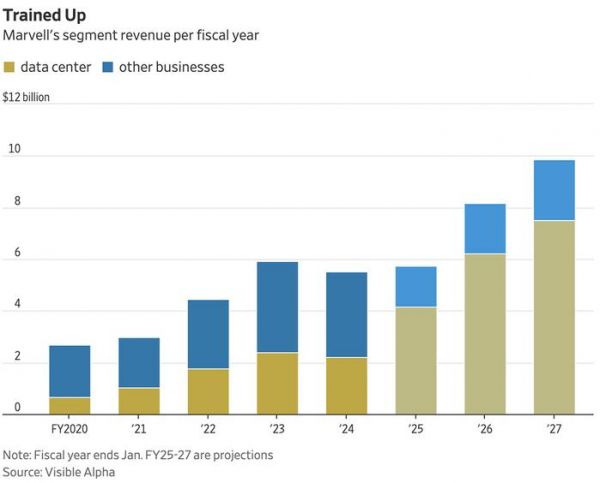 ▲2020~2027财年Marvell主要业务收入分布(图源:《华尔街日报》)据《华尔街日报》报道,数据分析平台Visible Alpha预期这有望推动Marvell 2026财年的年收入超过80亿美元,较今年预期增长40%;并预计第二年将增长20%,届时Marvell将跟另一家科技大厂合作定制AI芯片。分析师推测该客户会是微软。
