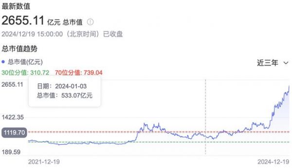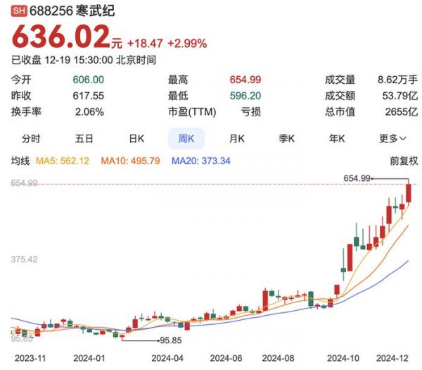 12月18日,寒武纪股价突破600元/股,市值突破2500亿人民币大关,在科创板排名第三,仅次于中芯国际和海光信息。