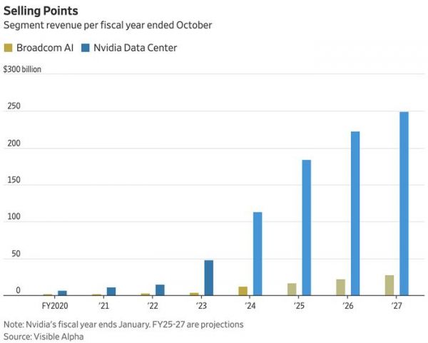 ▲截至10月,博通AI和英伟达数据中心每个财政年度的业务收入(图源:《华尔街日报》)一家独大的AI芯片巨头英伟达,市值已稳坐3万亿美元。而博通的下一阶两万亿美元,可能就不会像第一个那么容易实现了。