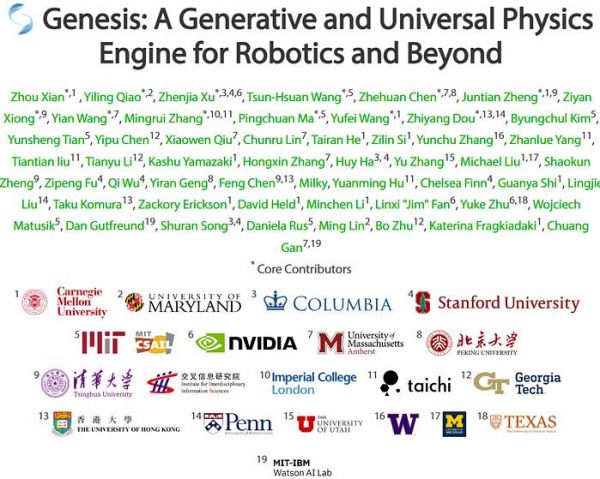 来自卡内基梅隆大学、斯坦福大学、麻省理工计算机科学与人工智能实验室、英伟达和清华大学的众多核心贡献者推出了一个全新的物理仿真平台Genesis,专为通用机器人、具身人工智能和物理AI应用而设计。