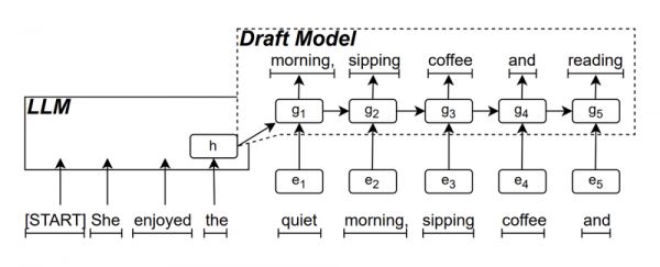这个模型的工作原理是:LLM在文本生成过程中首先生成一个初始token,然后RNN草稿模型利用该token和LLM的最后一层隐藏状态作为输入进行束搜索(beam search),进而生成多个候选tokens序列。