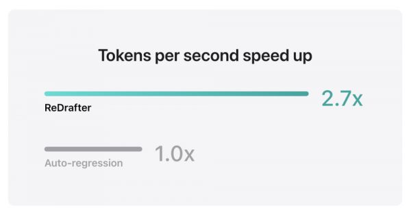 苹果的基准测试结果显示,在NVIDIA H100 GPU上对数十亿参数的生产模型使用集成了ReDrafter的TensorRT-LLM时,其贪心解码(Greedy Decoding)每秒生成的tokens数量提高了2.7倍。