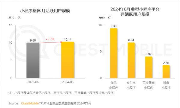 根据Quest Mobile统计数据,微信小程序月活在9亿以上,而支付宝小程序月活在6.5亿附近浮动;更显著的差距是,支付宝小程序的交易次数仅为微信小程序的16%。