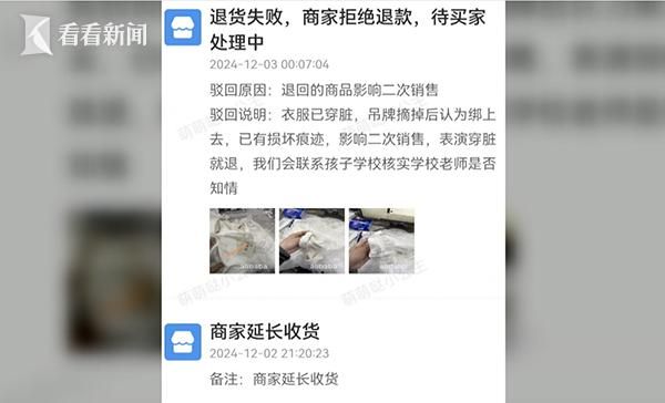 11月18日,买家在委托人的店铺购买了两套单价分别为118元和128元的儿童演出服。11天后,买家要求退货退款。童装商家告诉看看新闻记者,“我们录开包视频的时候,衣服已经团在一起,拧成疙瘩塞进去的。吊牌摘了,是买家自己用手绑回去的,衣服领子、袖口都是穿脏的。我们就跟她说了,这个衣服影响二次销售了,视频也发给她了,然后她就不停投诉。”买家随即申请平台介入争议,最终买家收到商家拒收的衣服,却以商家服务态度恶劣为由,拿到了50元退款。