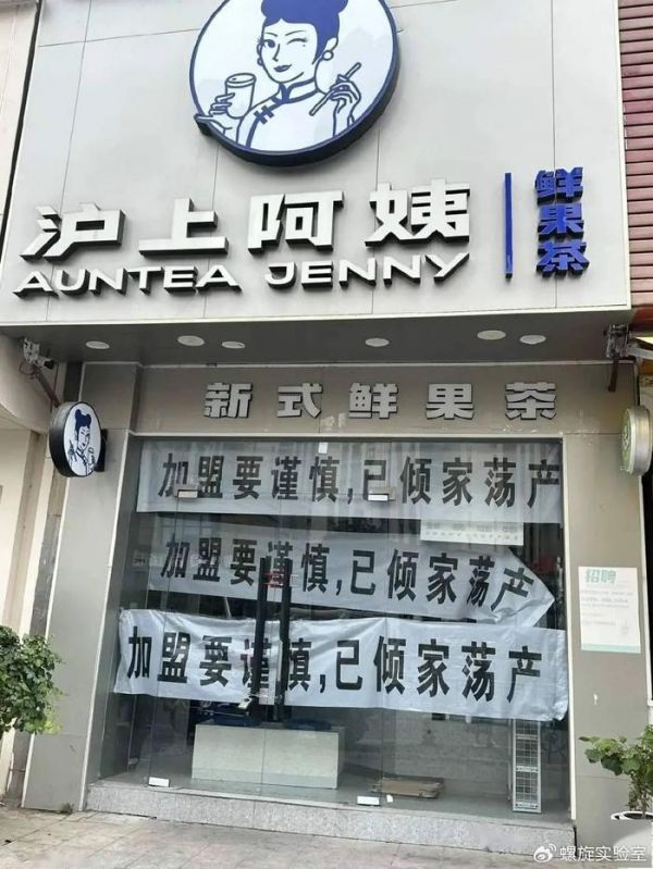 书亦烧仙草大规模关店,二手设备贱卖的场景令人唏嘘。最近,更是有家沪上阿姨的加盟者崩溃,直接在门口挂上了“加盟要谨慎,已倾家荡产”的横幅。