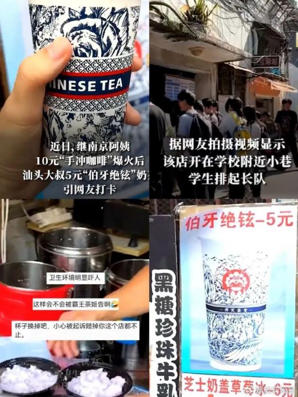 而霸王茶姬的主推款伯牙绝弦更是在社交平台上被频频复刻,很多路边小商贩打出“5元伯牙绝铉”的名号,用着高仿复刻纸杯舀起奶茶,探店博主纷纷评价“几乎和正品一样”,让高高在上的伯牙绝弦被揭开神秘面纱。