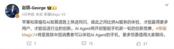 在这之前,荣耀CEO赵明就曾预告过Magic7系列,并表示这将是首款中国消费者可以体验AI Agent的手机,“领先苹果”。与前东家华为“遥遥领先”的口号如出一辙。