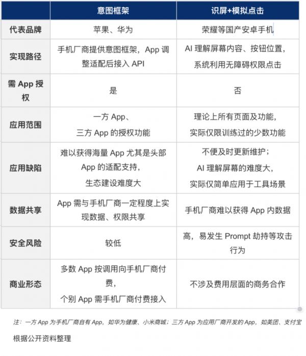 业内人士透露,“在这一轮AI竞赛中,手机厂商大已发展出两大技术路线,一种是‘签订意图框架’,另一种是‘模拟用户识屏+模拟点击’操作”。