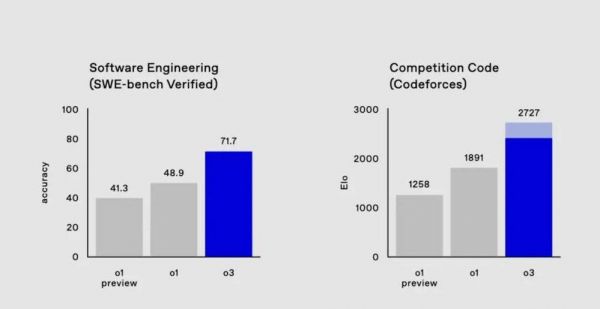 被广为讨论的是其代码能力。在目前全世界最大的算法练习和竞赛平台Codeforces上,o3得分为2727分、相较o1提升了800多分,相当于位列175名的人类选手。甚至,它超过了OpenAI的研究高级副总裁Mark Chen(得分2500分)。