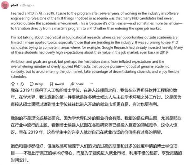 有 AI 博士现身说法,指出很多博士研究者对学术环境之外的状况关注不足,从而对未来的职业有了过高的期待。