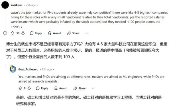 而博士研究者虽然收入高,但行业需求不足,毕竟一家公司并不需要那么多研究科学家: